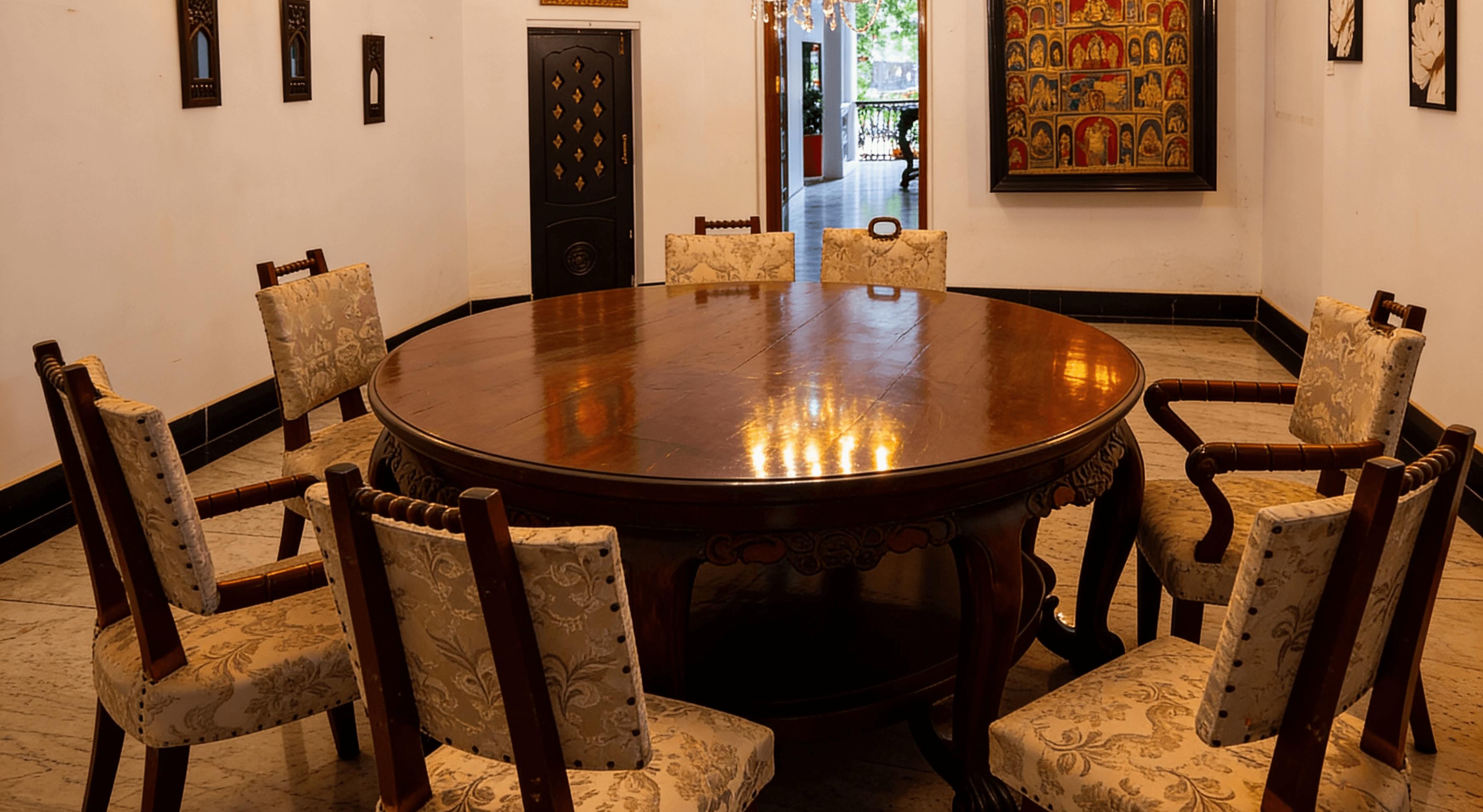 Gifted by the Mysore Odeyar, these Tanjavoor paintings reflect timeless artistry and rich cultural heritage, adding a quiet sense of royalty to the space.